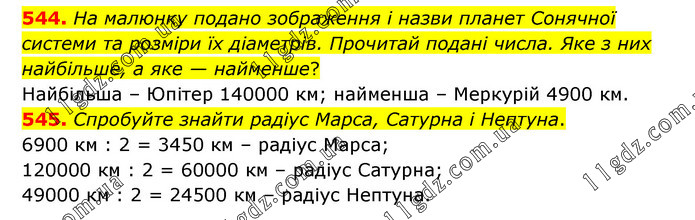 544. На малюнку подано зображення і назви планет Сонячної системи та розміри їх діаметрів. Прочитай подані числа. Яке з них найбільше, а яке — найменше? Найбільша – Юпітер 140000 км; найменша – Меркурій 4900 км. 545. Спробуйте знайти радіус Марса, Сатурна і Нептуна. 6900 км : 2 = 3450 км – радіус Марса; 120000 км : 2 = 60000 км – радіус Сатурна; 49000 км : 2 = 24500 км – радіус Нептуна.