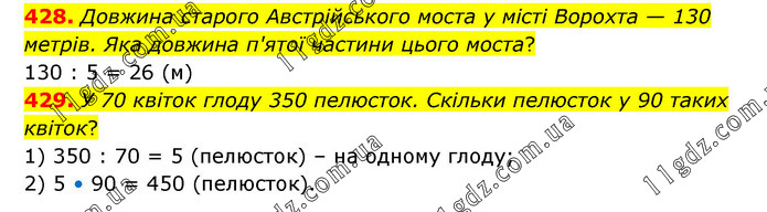428. Довжина старого Австрійського моста у місті Ворохта — 130 метрів. Яка довжина п'ятої частини цього моста? 130 : 5 = 26 (м) 429. У 70 квіток глоду 350 пелюсток. Скільки пелюсток у 90 таких квіток? 1) 350 : 70 = 5 (пелюсток) – на одному глоду; 2) 5 • 90 = 450 (пелюсток).