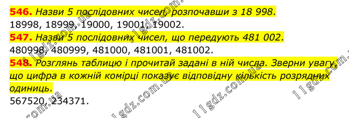 546. Назви 5 послідовних чисел, розпочавши з 18 998. 18998, 18999, 19000, 19001, 19002. 547. Назви 5 послідовних чисел, що передують 481 002. 480998, 480999, 481000, 481001, 481002. 548. Розглянь таблицю і прочитай задані в ній числа. Зверни увагу, що цифра в кожній комірці показує відповідну кількість розрядних одиниць. 567520, 234371.