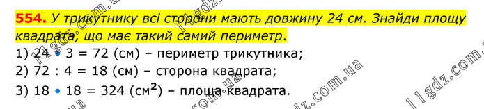 У трикутнику всі сторони мають довжину 24 см. Знайди площу квадрата, що має такий самий периметр. 1) 24 • 3 = 72 (см) – периметр трикутника; 2) 72 : 4 = 18 (см) – сторона квадрата; 3) 18 • 18 = 324 (см2) – площа квадрата.