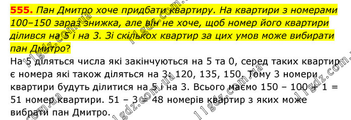 Пан Дмитро хоче придбати квартиру. На квартири з номерами 100–150 зараз знижка, але він не хоче, щоб номер його квартири ділився на 5 і на 3. Зі скількох квартир за цих умов може вибирати пан Дмитро? На 5 діляться числа які закінчуються на 5 та 0, серед таких квартир є номера які також діляться на 3: 120, 135, 150. Тому 3 номери квартири будуть ділитися на 5 і на 3. Всього маємо 150 – 100 + 1 = 51 номер квартири. 51 – 3 = 48 номерів квартир з яких може вибрати пан Дмитро.