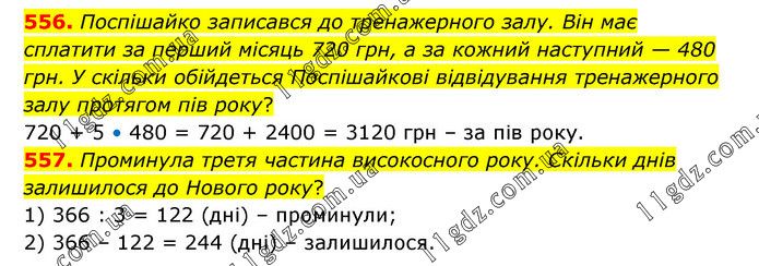 556. Поспішайко записався до тренажерного залу. Він має сплатити за перший місяць 720 грн, а за кожний наступний — 480 грн. У скільки обійдеться Поспішайкові відвідування тренажерного залу протягом пів року? 720 + 5 • 480 = 720 + 2400 = 3120 грн – за пів року. 557. Проминула третя частина високосного року. Скільки днів залишилося до Нового року? 1) 366 : 3 = 122 (дні) – проминули; 2) 366 – 122 = 244 (дні) – залишилося.