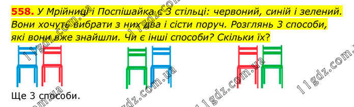 У Мрійниці і Поспішайка є 3 стільці: червоний, синій і зелений. Вони хочуть вибрати з них два і сісти поруч. Розглянь 3 способи, які вони вже знайшли. Чи є інші способи? Скільки їх? Ще 3 способи.