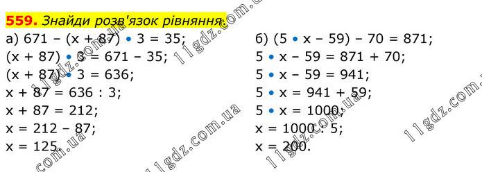 Знайди розв'язок рівняння. а) 671 – (х + 87) • 3 = 35; (х + 87) • 3 = 671 – 35; (х + 87) • 3 = 636; х + 87 = 636 : 3; х + 87 = 212; х = 212 – 87; х = 125. б) (5 • х – 59) – 70 = 871; 5 • х – 59 = 871 + 70; 5 • х – 59 = 941; 5 • х = 941 + 59; 5 • х = 1000; х = 1000 : 5; х = 200.
