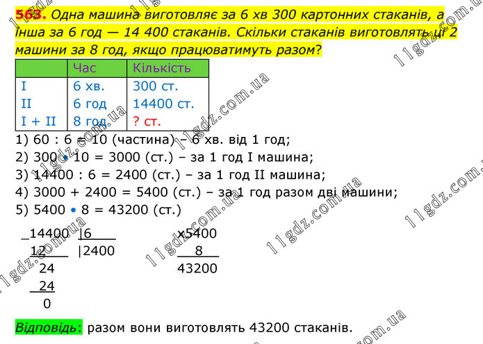 Одна машина виготовляє за 6 хв 300 картонних стаканів, а інша за 6 год — 14 400 стаканів. Скільки стаканів виготовлять ці 2 машини за 8 год, якщо працюватимуть разом? 1) 60 : 6 = 10 (частина) – 6 хв. від 1 год; 2) 300 • 10 = 3000 (ст.) – за 1 год І машина; 3) 14400 : 6 = 2400 (ст.) – за 1 год ІІ машина; 4) 3000 + 2400 = 5400 (ст.) – за 1 год разом дві машини; 5) 5400 • 8 = 43200 (ст.) Відповідь: разом вони виготовлять 43200 стаканів.