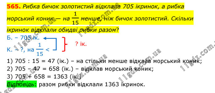 Рибка бичок золотистий відклала 705 ікринок, а рибка морський коник — на 1/15 менше, ніж бичок золотистий. Скільки ікринок відклали обидві рибки разом? Б. – 705 ік. К. – ?, на 1/15 < 1) 705 : 15 = 47 (ік.) – на стільки менше відклав морський коник; 2) 705 – 47 = 658 (ік.) – відклав морський коник; 3) 705 + 658 = 1363 (ік.) Відповідь: разом рибки відклали 1363 ікринок.