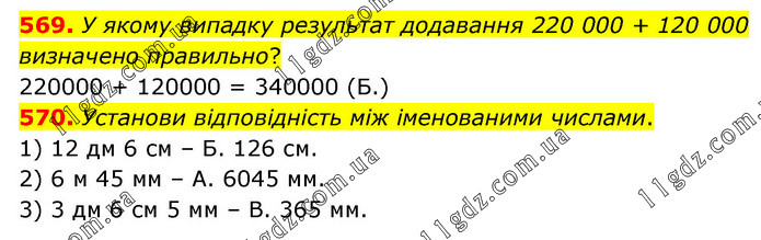 569. У якому випадку результат додавання 220 000 + 120 000 визначено правильно? 220000 + 120000 = 340000 (Б.) 570. Установи відповідність між іменованими числами. 1) 12 дм 6 см – Б. 126 см. 2) 6 м 45 мм – А. 6045 мм. 3) 3 дм 6 см 5 мм – В. 365 мм.