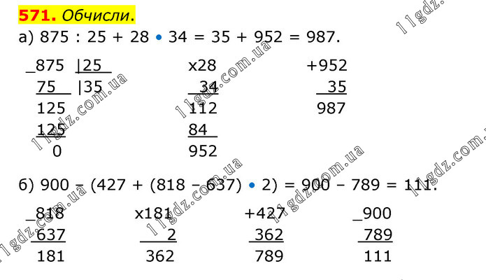 Обчисли. а) 875 : 25 + 28 • 34 = 35 + 952 = 987. б) 900 – (427 + (818 – 637) • 2) = 900 – 789 = 111.