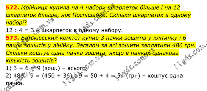 572. Мрійниця купила на 4 набори шкарпеток більше і на 12 шкарпеток більше, ніж Поспішайко. Скільки шкарпеток в одному наборі? 12 : 4 = 3 – шкарпеток в одному набору. 573. Батьківський комітет купив 3 пачки зошитів у клітинку і 6 пачок зошитів у лінійку. Загалом за всі зошити заплатили 486 грн. Скільки коштує одна пачка зошита, якщо в пачках однакова кількість зошитів? 1) 3 + 6 = 9 (зош.) – всього; 2) 486 : 9 = (450 + 36) : 9 = 50 + 4 = 54 (грн) – коштує одна пачка.
