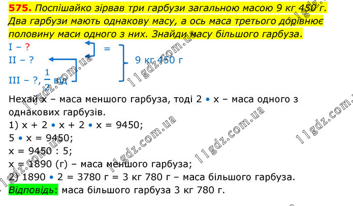 Поспішайко зірвав три гарбузи загальною масою 9 кг 450 г. Два гарбузи мають однакову масу, а ось маса третього дорівнює половину маси одного з них. Знайди масу більшого гарбуза. І – ? ІІ – ? 9 кг 450 г ІІІ – ?, 1/2 від Нехай х – маса меншого гарбуза, тоді 2 • х – маса одного з однакових гарбузів. 1) х + 2 • х + 2 • х = 9450; 5 • х = 9450; х = 9450 : 5; х = 1890 (г) – маса меншого гарбуза; 2) 1890 • 2 = 3780 г = 3 кг 780 г – маса більшого гарбуза. Відповідь: маса більшого гарбуза 3 кг 780 г.