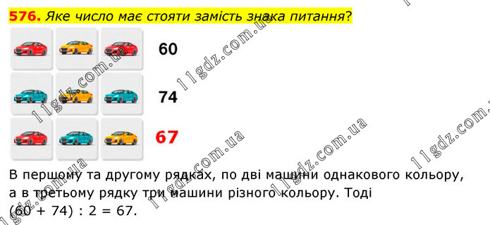Яке число має стояти замість знака питання? В першому та другому рядках, по дві машини однакового кольору, а в третьому рядку три машини різного кольору. Тоді (60 + 74) : 2 = 67.