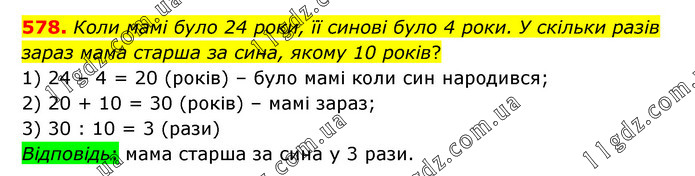 Коли мамі було 24 роки, її синові було 4 роки. У скільки разів зараз мама старша за сина, якому 10 років? 1) 24 – 4 = 20 (років) – було мамі коли син народився; 2) 20 + 10 = 30 (років) – мамі зараз; 3) 30 : 10 = 3 (рази) Відповідь: мама старша за сина у 3 рази.
