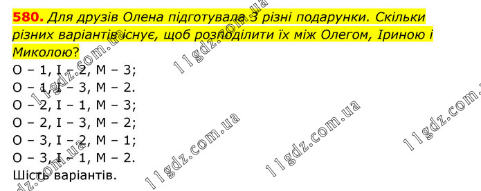 Для друзів Олена підготувала 3 різні подарунки. Скільки різних варіантів існує, щоб розподілити їх між Олегом, Іриною і Миколою? О – 1, І – 2, М – 3; О – 1, І – 3, М – 2. О – 2, І – 1, М – 3; О – 2, І – 3, М – 2; О – 3, І – 2, М – 1; О – 3, І – 1, М – 2. Шість варіантів.