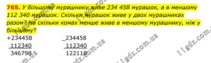 У більшому мурашнику живе 234 458 мурашок, а в меншому 112 340 мурашок. Скільки мурашок живе у двох мурашниках разом? На скільки комах менше живе в меншому мурашнику, ніж у більшому?