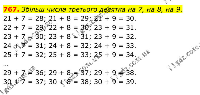 Збільш числа третього десятка на 7, на 8, на 9. 21 + 7 = 28; 21 + 8 = 29; 21 + 9 = 30. 22 + 7 = 29; 22 + 8 = 30; 23 + 9 = 31. 23 + 7 = 30; 23 + 8 = 31; 23 + 9 = 32. 24 + 7 = 31; 24 + 8 = 32; 24 + 9 = 33. 25 + 7 = 32; 25 + 8 = 33; 25 + 9 = 34. … 29 + 7 = 36; 29 + 8 = 37; 29 + 9 = 38. 30 + 7 = 37; 30 + 8 = 38; 30 + 9 = 39.