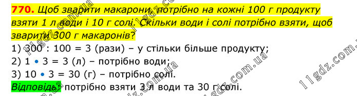 Щоб зварити макарони, потрібно на кожні 100 г продукту взяти 1 л води і 10 г солі. Скільки води і солі потрібно взяти, щоб зварити 300 г макаронів? 1) 300 : 100 = 3 (рази) – у стільки більше продукту; 2) 1 • 3 = 3 (л) – потрібно води; 3) 10 • 3 = 30 (г) – потрібно солі. Відповідь: потрібно взяти 3 л води та 30 г солі.