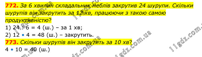 772. За 6 хвилин складальник меблів закрутив 24 шурупи. Скільки шурупів він закрутить за 12 хв, працюючи з такою самою продуктивністю? 1) 24 : 6 = 4 (ш.) – за 1 хв; 2) 12 • 4 = 48 (ш.) – закрутить. 773. Скільки шурупів він закрутить за 10 хв? 4 • 10 = 40 (ш.)