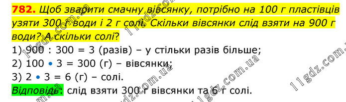 Щоб зварити смачну вівсянку, потрібно на 100 г пластівців узяти 300 г води і 2 г солі. Скільки вівсянки слід взяти на 900 г води? А скільки солі? 1) 900 : 300 = 3 (разів) – у стільки разів більше; 2) 100 • 3 = 300 (г) – вівсянки; 3) 2 • 3 = 6 (г) – солі. Відповідь: слід взяти 300 г вівсянки та 6 г солі.