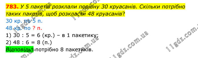 У 5 пакетів розклали порівну 30 круасанів. Скільки потрібно таких пакетів, щоб розкласти 48 круасанів? 30 кр. по 5 п. 48 кр. по ? п. 1) 30 : 5 = 6 (кр.) – в 1 пакетику; 2) 48 : 6 = 8 (п.) Відповідь: потрібно 8 пакетиків.