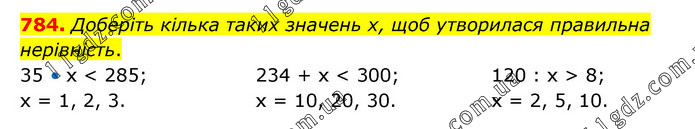 Доберіть кілька таких значень х, щоб утворилася правильна нерівність. 35 • х < 285; х = 1, 2, 3. 234 + х < 300; х = 10, 20, 30. 120 : х > 8; х = 2, 5, 10.