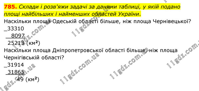 Склади і розв'яжи задачі за даними таблиці, у якій подано площі найбільших і найменших областей України. Наскільки площа Одеській області більше, ніж площа Чернівецької? 25213 (км2) Наскільки площа Дніпропетровської області більше, ніж площа Чернігівській області? 49 (км2)