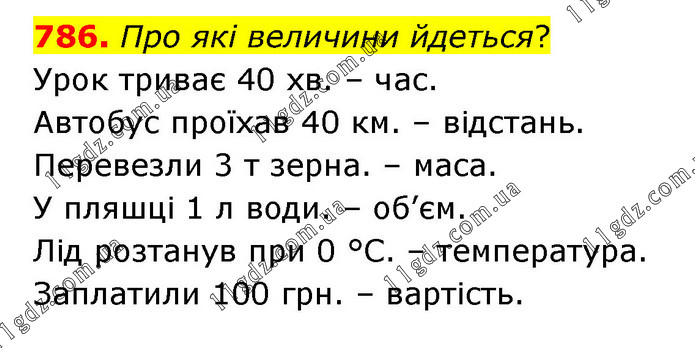 Про які величини йдеться? Урок триває 40 хв. – час. Автобус проїхав 40 км. – відстань. Перевезли 3 т зерна. – маса. У пляшці 1 л води. – об’єм. Лід розтанув при 0 °С. – температура. Заплатили 100 грн. – вартість.