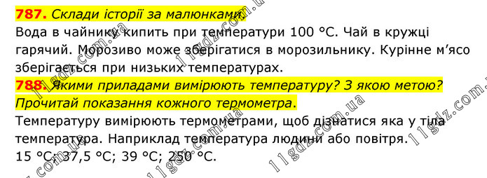 787. Склади історії за малюнками. Вода в чайнику кипить при температури 100 °С. Чай в кружці гарячий. Морозиво може зберігатися в морозильнику. Курінне м’ясо зберігається при низьких температурах. 788. Якими приладами вимірюють температуру? З якою метою? Прочитай показання кожного термометра. Температуру вимірюють термометрами, щоб дізнатися яка у тіла температура. Наприклад температура людини або повітря. 15 °С; 37,5 °С; 39 °С; 250 °С.