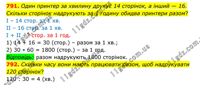 791. Один принтер за хвилину друкує 14 сторінок, а інший — 16. Скільки сторінок надрукують за 1 годину обидва принтери разом? І – 14 стор. за 1 хв. ІІ – 16 стор. за 1 хв. І + ІІ - ? стор. за 1 год. 1) 14 + 16 = 30 (стор.) – разом за 1 хв.; 2) 30 • 60 = 1800 (стор.) – за 1 год. Відповідь: разом надрукують 1800 сторінок. 792. Скільки часу вони мають працювати разом, щоб надрукувати 120 сторінок? 120 : 30 = 4 (хв.)