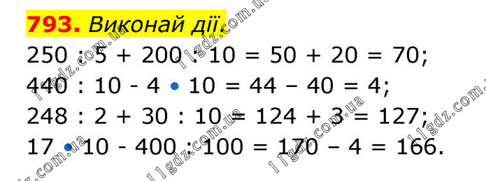 Виконай дії. 250 : 5 + 200 : 10 = 50 + 20 = 70; 440 : 10 - 4 • 10 = 44 – 40 = 4; 248 : 2 + 30 : 10 = 124 + 3 = 127; 17 • 10 - 400 : 100 = 170 – 4 = 166.