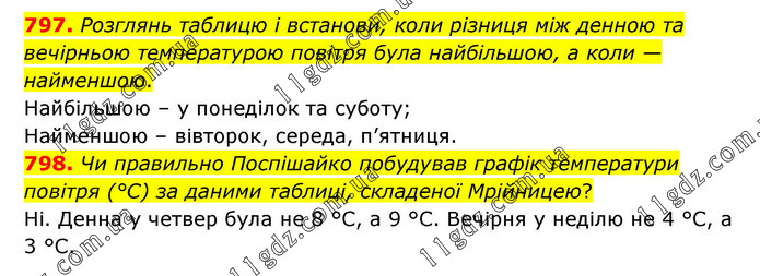 797. Розглянь таблицю і встанови, коли різниця між денною та вечірньою температурою повітря була найбільшою, а коли — найменшою. Найбільшою – у понеділок та суботу; Найменшою – вівторок, середа, п’ятниця. 798. Чи правильно Поспішайко побудував графік температури повітря (°С) за даними таблиці, складеної Мрійницею? Ні. Денна у четвер була не 8 °С, а 9 °С. Вечірня у неділю не 4 °С, а 3 °С.