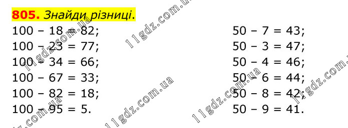 Знайди різниці. 100 – 18 = 82; 100 – 23 = 77; 100 – 34 = 66; 100 – 67 = 33; 100 – 82 = 18; 100 – 95 = 5. 50 – 7 = 43; 50 – 3 = 47; 50 – 4 = 46; 50 – 6 = 44; 50 – 8 = 42; 50 – 9 = 41.