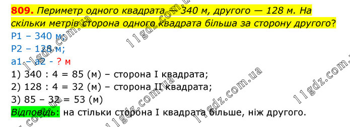 Периметр одного квадрата — 340 м, другого — 128 м. На скільки метрів сторона одного квадрата більша за сторону другого? Р1 – 340 м; Р2 – 128 м; а1 – а2 - ? м 1) 340 : 4 = 85 (м) – сторона І квадрата; 2) 128 : 4 = 32 (м) – сторона ІІ квадрата; 3) 85 – 32 = 53 (м) Відповідь: на стільки сторона І квадрата більше, ніж другого.