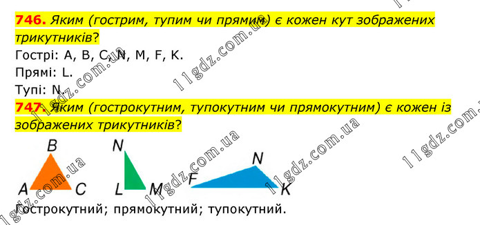 746. Яким (гострим, тупим чи прямим) є кожен кут зображених трикутників? Гострі: А, В, С, N, M, F, K. Прямі: L. Тупі: N. 747. Яким (гострокутним, тупокутним чи прямокутним) є кожен із зображених трикутників? Гострокутний; прямокутний; тупокутний.