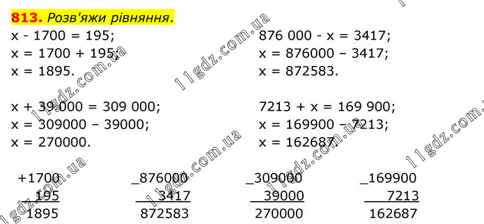 Розв'яжи рівняння. x - 1700 = 195; х = 1700 + 195; х = 1895. 876 000 - x = 3417; х = 876000 – 3417; х = 872583. x + 39 000 = 309 000; х = 309000 – 39000; х = 270000. 7213 + x = 169 900; х = 169900 – 7213; х = 162687.