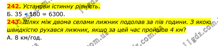 242. Установи істинну рівність. Б. 35 • 180 = 6300. 243. Шлях між двома селами лижник подолав за пів години. З якою швидкістю рухався лижник, якщо за цей час пройшов 4 км? А. 8 км/год.