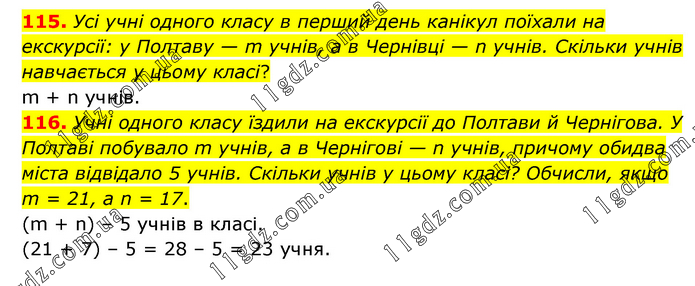 115. Усі учні одного класу в перший день канікул поїхали на екскурсії: у Полтаву — m учнів, а в Чернівці — n учнів. Скільки учнів навчається у цьому класі? m + n учнів. 116. Учні одного класу їздили на екскурсії до Полтави й Чернігова. У Полтаві побувало m учнів, а в Чернігові — n учнів, причому обидва міста відвідало 5 учнів. Скільки учнів у цьому класі? Обчисли, якщо m = 21, a n = 17. (m + n) – 5 учнів в класі. (21 + 7) – 5 = 28 – 5 = 23 учня.