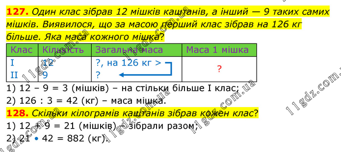 Один клас зібрав 12 мішків каштанів, а інший — 9 таких самих мішків. Виявилося, що за масою перший клас зібрав на 126 кг більше. Яка маса кожного мішка? 1) 12 – 9 = 3 (мішків) – на стільки більше І клас; 2) 126 : 3 = 42 (кг) – маса мішка. 128. Скільки кілограмів каштанів зібрав кожен клас? 1) 12 + 9 = 21 (мішків) – зібрали разом; 2) 21 • 42 = 882 (кг).