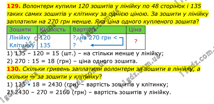 Волонтери купили 120 зошитів у лінійку по 48 сторінок і 135 таких самих зошитів у клітинку за однією ціною. За зошити у лінійку заплатили на 270 грн менше. Яка ціна одного купленого зошита? 1) 135 – 120 = 15 (шт.) – на стільки менше у лінійку; 2) 270 : 15 = 18 (грн) – ціна одного зошита. 130. Скільки гривень заплатили волонтери за зошити в лінійку, а скільки — за зошити у клітинку? 1) 135 • 18 = 2430 (грн) – вартість зошитів у клітинку; 2) 2430 – 270 = 2160 (грн) – вартість зошитів у лінійку.