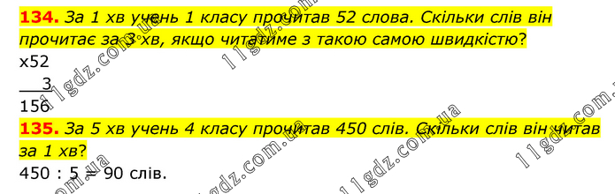134. За 1 хв учень 1 класу прочитав 52 слова. Скільки слів він прочитає за 3 хв, якщо читатиме з такою самою швидкістю? 135. За 5 хв учень 4 класу прочитав 450 слів. Скільки слів він читав за 1 хв? 450 : 5 = 90 слів.
