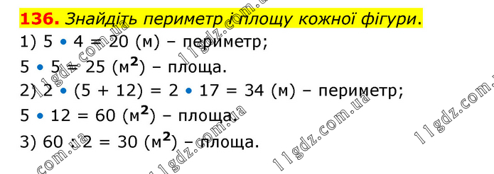 Знайдіть периметр і площу кожної фігури. 1) 5 • 4 = 20 (м) – периметр; 5 • 5 = 25 (м2) – площа. 2) 2 • (5 + 12) = 2 • 17 = 34 (м) – периметр; 5 • 12 = 60 (м2) – площа. 3) 60 : 2 = 30 (м2) – площа.