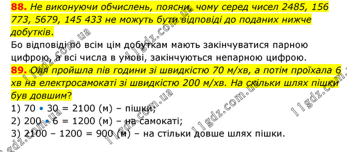 88. Не виконуючи обчислень, поясни, чому серед чисел 2485, 156 773, 5679, 145 433 не можуть бути відповіді до поданих нижче добутків. Бо відповіді по всім цім добуткам мають закінчуватися парною цифрою, а всі числа в умові, закінчуються непарною цифрою. 89. Оля пройшла пів години зі швидкістю 70 м/хв, а потім проїхала 6 хв на електросамокаті зі швидкістю 200 м/хв. На скільки шлях пішки був довшим? 1) 70 • 30 = 2100 (м) – пішки; 2) 200 • 6 = 1200 (м) – на самокаті; 3) 2100 – 1200 = 900 (м) – на стільки довше шлях пішки.