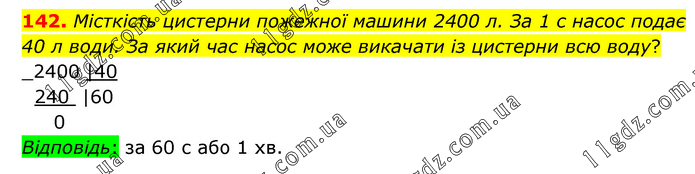 Місткість цистерни пожежної машини 2400 л. За 1 с насос подає 40 л води. За який час насос може викачати із цистерни всю воду? Відповідь: за 60 с або 1 хв.