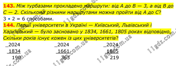 143. Між турбазами прокладено маршрути: від А до В — 3, а від В до С — 2. Скількома різними маршрутами можна пройти від А до С? 3 • 2 = 6 способами. 144. Перші університети в Україні — Київський, Львівський і Харківський — було засновано у 1834, 1661, 1805 роках відповідно. Скільки років існує кожен із цих університетів?