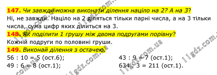 147. Чи завжди можна виконати ділення націло на 2? А на 3? Ні, не завжди. Націло на 2 діляться тільки парні числа, а на 3 тільки числа, сума цифр яких ділиться на 3. 148. Як поділити 1 грушу між двома подругами порівну? Кожній подруги по половині груши. 149. Виконай ділення з остачею. 56 : 10 = 5 (ост.6); 49 : 6 = 8 (ост.1); 43 : 9 = 7 (ост.1); 634 : 3 = 211 (ост.1).
