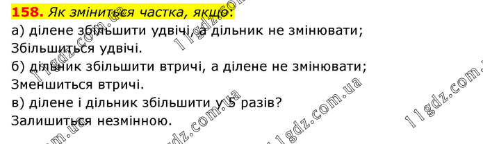 Як зміниться частка, якщо: а) ділене збільшити удвічі, а дільник не змінювати; Збільшиться удвічі. б) дільник збільшити втричі, а ділене не змінювати; Зменшиться втричі. в) ділене і дільник збільшити у 5 разів? Залишиться незмінною.