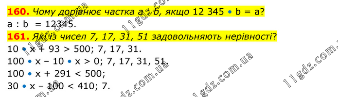160. Чому дорівнює частка а : b, якщо 12 345 • b = а? a : b = 12345. 161. Які із чисел 7, 17, 31, 51 задовольняють нерівності? 10 • х + 93 > 500; 7, 17, 31. 100 • х – 10 • х > 0; 7, 17, 31, 51. 100 • х + 291 < 500; 30 • х – 100 < 410; 7.