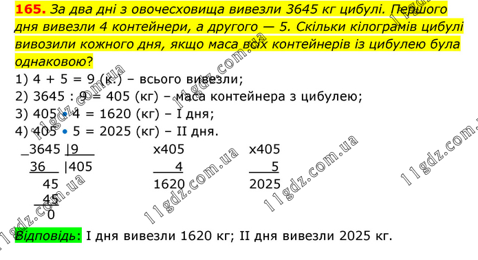 За два дні з овочесховища вивезли 3645 кг цибулі. Першого дня вивезли 4 контейнери, а другого — 5. Скільки кілограмів цибулі вивозили кожного дня, якщо маса всіх контейнерів із цибулею була однаковою? 1) 4 + 5 = 9 (к.) – всього вивезли; 2) 3645 : 9 = 405 (кг) – маса контейнера з цибулею; 3) 405 • 4 = 1620 (кг) – І дня; 4) 405 • 5 = 2025 (кг) – ІІ дня. Відповідь: І дня вивезли 1620 кг; ІІ дня вивезли 2025 кг.
