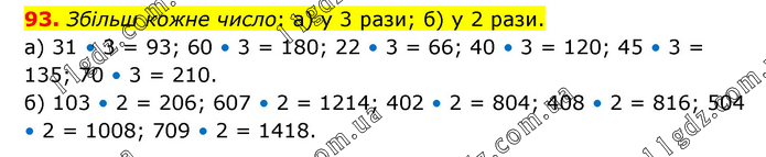 Збільш кожне число: а) у 3 рази; б) у 2 рази. а) 31 • 3 = 93; 60 • 3 = 180; 22 • 3 = 66; 40 • 3 = 120; 45 • 3 = 135; 70 • 3 = 210. б) 103 • 2 = 206; 607 • 2 = 1214; 402 • 2 = 804; 408 • 2 = 816; 504 • 2 = 1008; 709 • 2 = 1418.