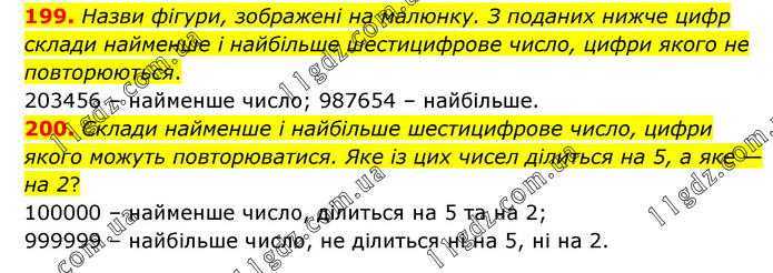 199. Назви фігури, зображені на малюнку. З поданих нижче цифр склади найменше і найбільше шестицифрове число, цифри якого не повторюються. 203456 – найменше число; 987654 – найбільше. 200. Склади найменше і найбільше шестицифрове число, цифри якого можуть повторюватися. Яке із цих чисел ділиться на 5, а яке — на 2? 100000 – найменше число, ділиться на 5 та на 2; 999999 – найбільше число, не ділиться ні на 5, ні на 2.