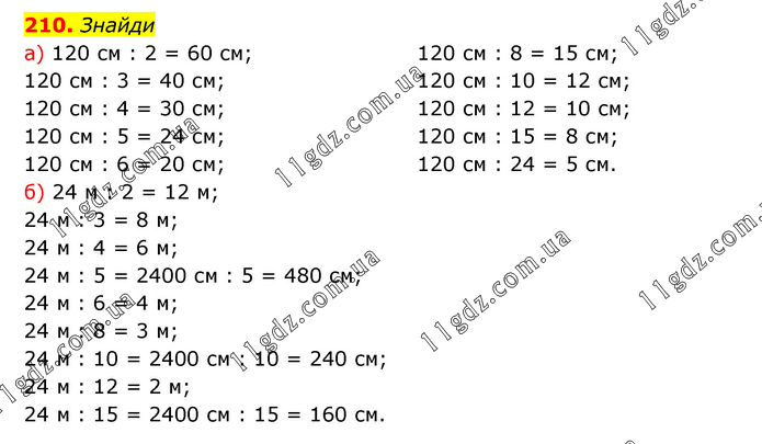 Знайди а) 120 см : 2 = 60 см; 120 см : 3 = 40 см; 120 см : 4 = 30 см; 120 см : 5 = 24 см; 120 см : 6 = 20 см; 120 см : 8 = 15 см; 120 см : 10 = 12 см; 120 см : 12 = 10 см; 120 см : 15 = 8 см; 120 см : 24 = 5 см. б) 24 м : 2 = 12 м; 24 м : 3 = 8 м; 24 м : 4 = 6 м; 24 м : 5 = 2400 см : 5 = 480 см; 24 м : 6 = 4 м; 24 м : 8 = 3 м; 24 м : 10 = 2400 см : 10 = 240 см; 24 м : 12 = 2 м; 24 м : 15 = 2400 см : 15 = 160 см.